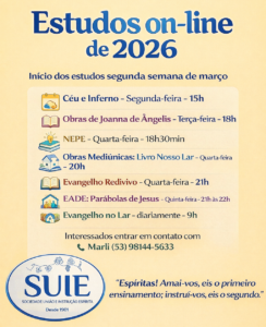 Segunda-feira – 20h30min – ESDE (Ensino Sistematizado da Doutrina Espírita) Segunda-feira – 20h – Evangelho Redivivo Terça-feira – 15h – Evangelho Redivivo Terça-feira – 14h30min – ESDE (Ensino Sistematizado da Doutrina Espírita) Sexta-feira – 20h – IEE – Introdução ao Estudo do Espiritismo