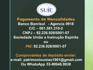 Banco Banrisul – 041 Agencia 0918 C/C – 061.581.310-2 CNPJ – 92.236.926/0001-07 PIX – 92.236.926/0001-07 Comprovantes de Depósito enviar: 📧 Email: patrimoniouniao1901@gmail.com 💬 WhatsApp: (53) 99946-9038